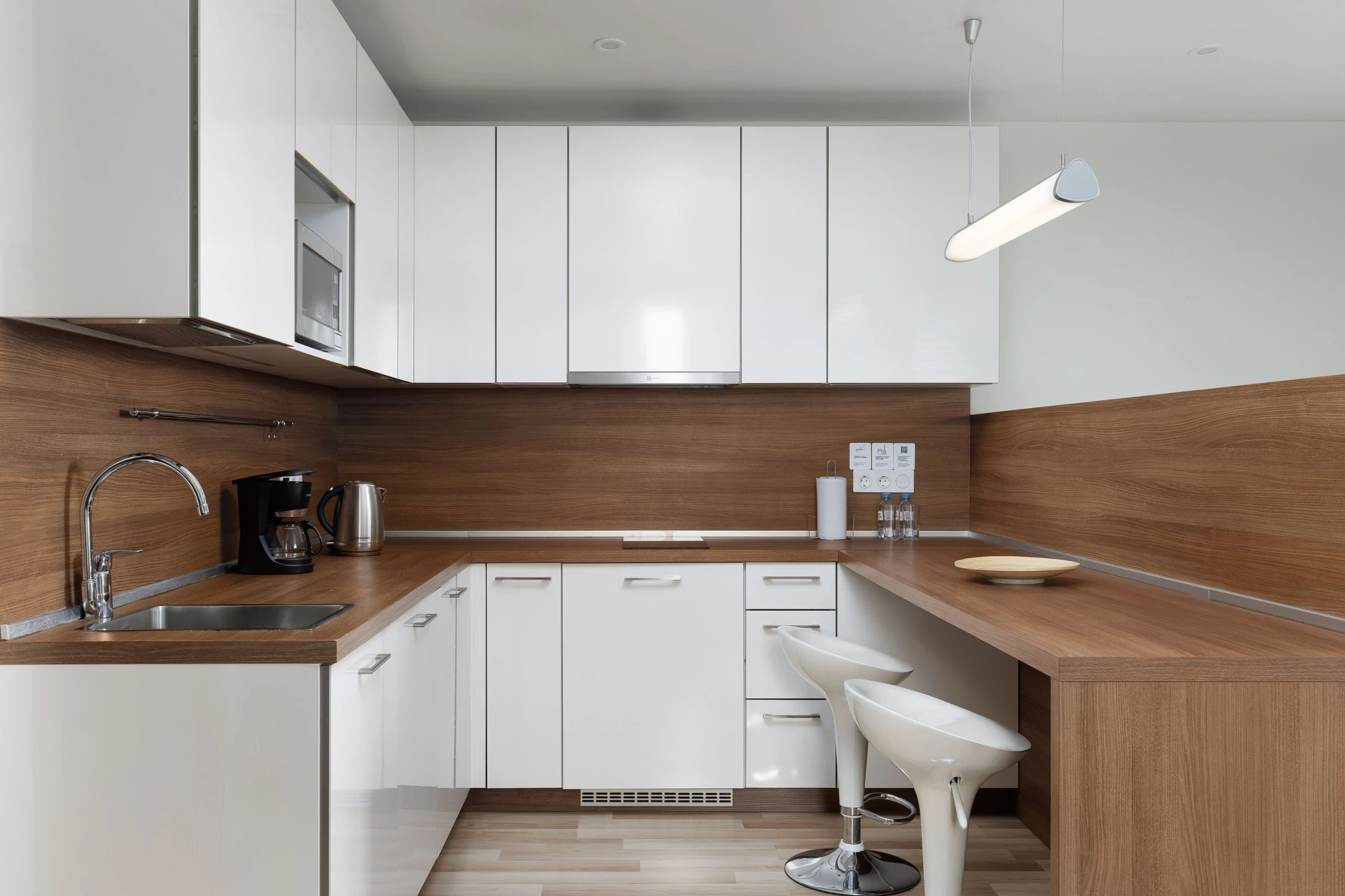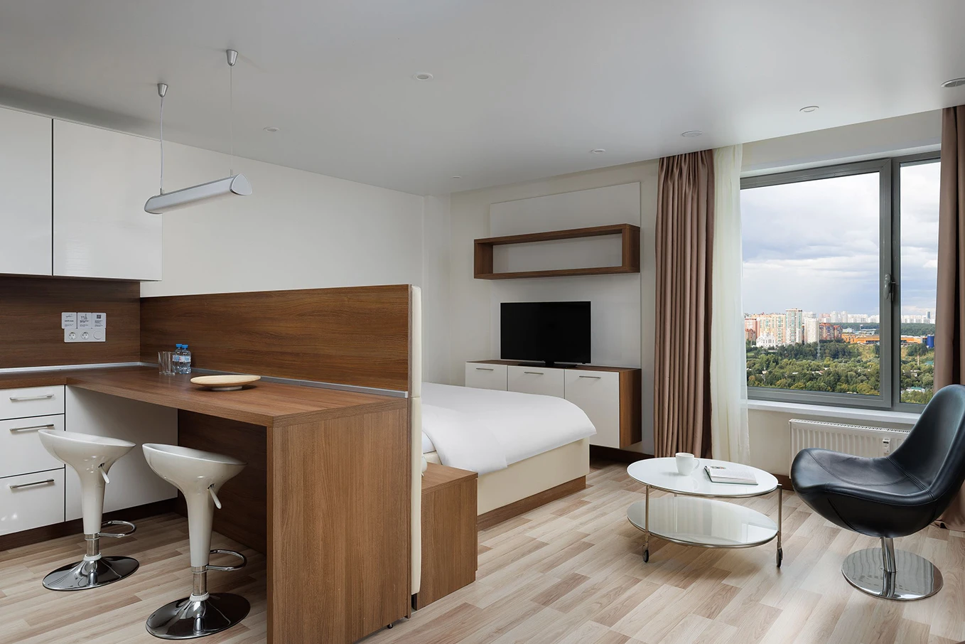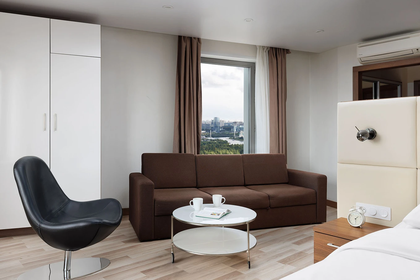 Deluxe apartments (37 square meters) are ideal for up to 3 people. The interior is designed in a modern style and decorated in calm beige and brown colors. The corner shape creates a feeling of spaciousness, and large windows fill the space with light. The room has everything you need for both short-term rentals and long-term stays: a private bathroom, a double bed, a sofa and a kitchen with a refrigerator, stove, microwave and washing machine. There are a total of 21 Deluxe apartments in the complex.