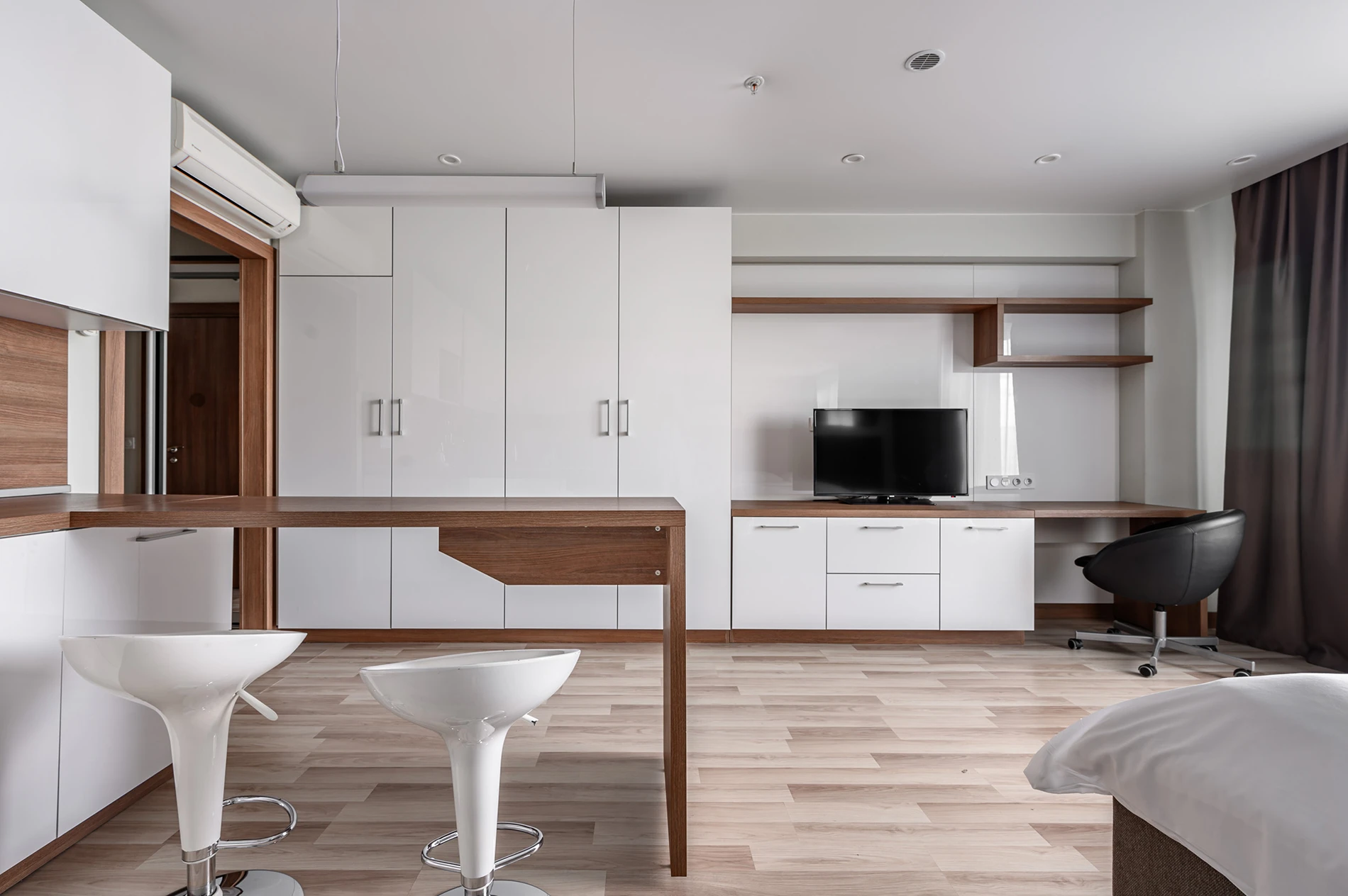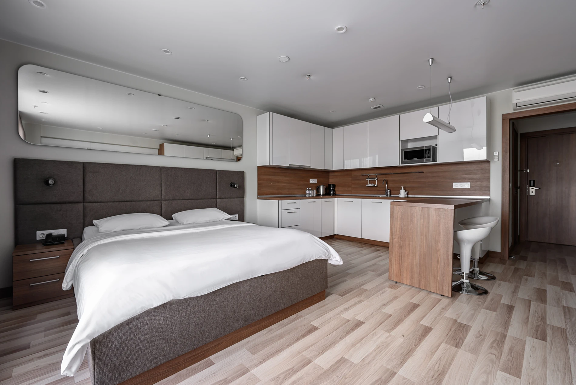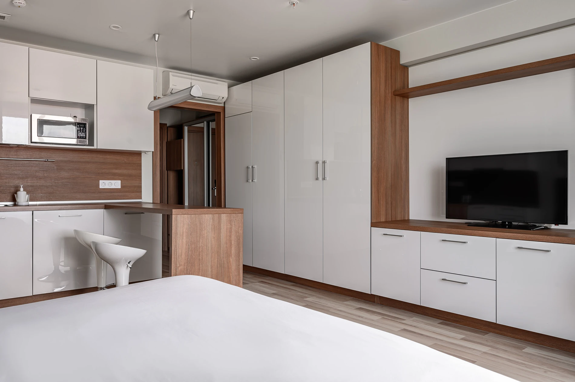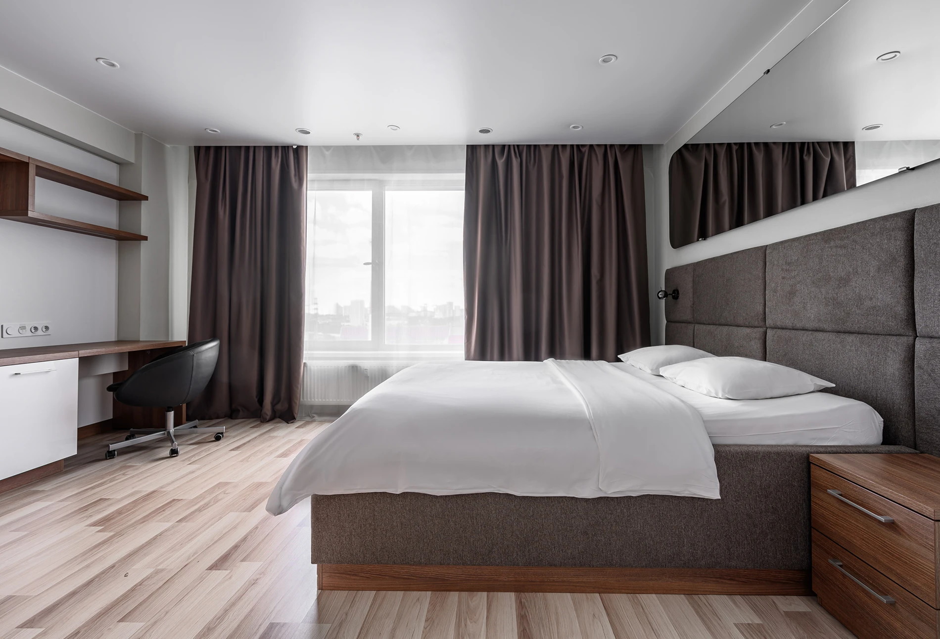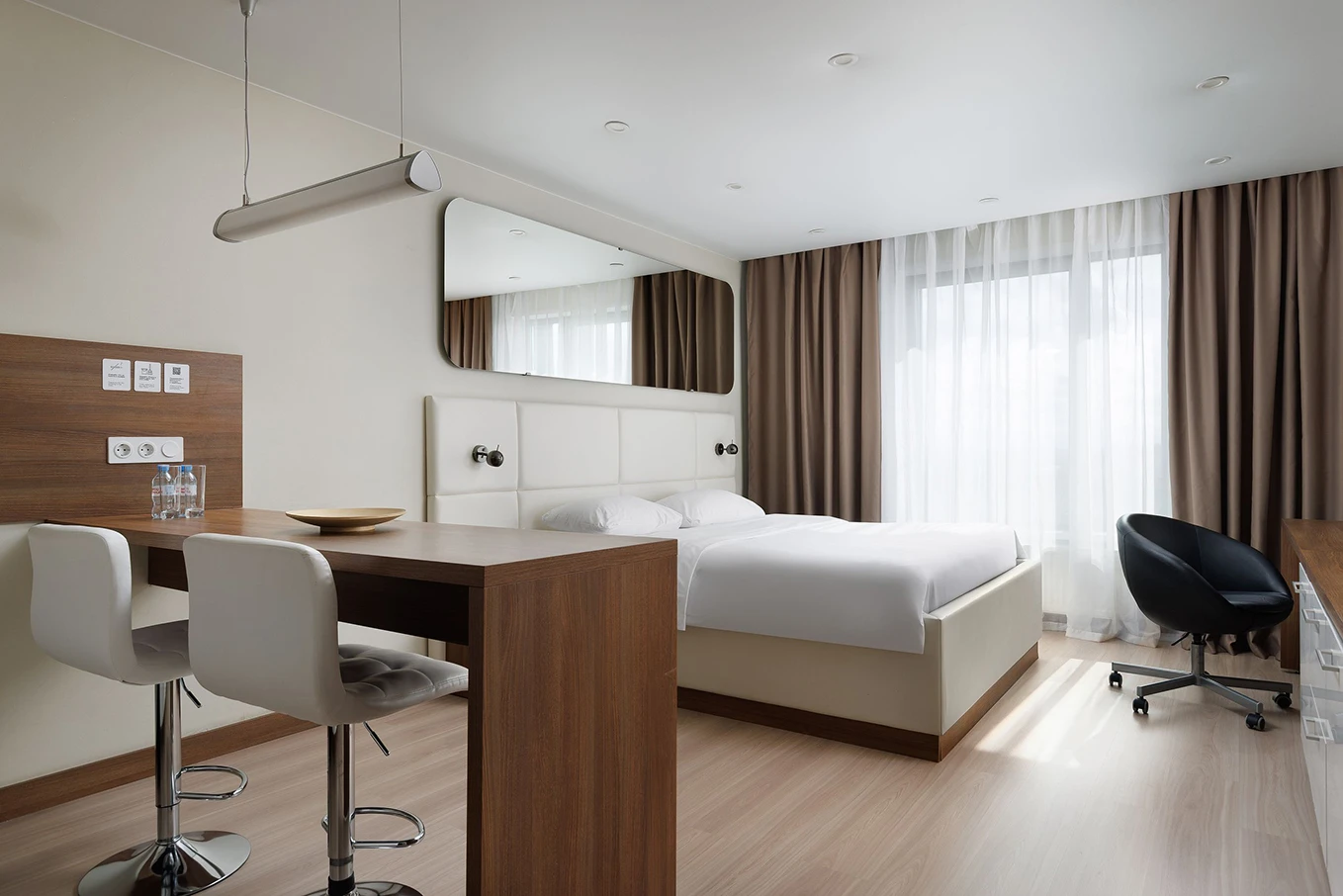 Superior+ apartments are ideal for 1-3 people. The interiors of the apartments presented in calm beige and brown tones. Such a color scheme will allow residents to easily adapt the apartments for themselves, create an atmosphere of home comfort, adding color accents using accessories or plants. There is a total of 63 Superior+ apartments in the complex with a different layout of furniture - you can always choose something to your liking.