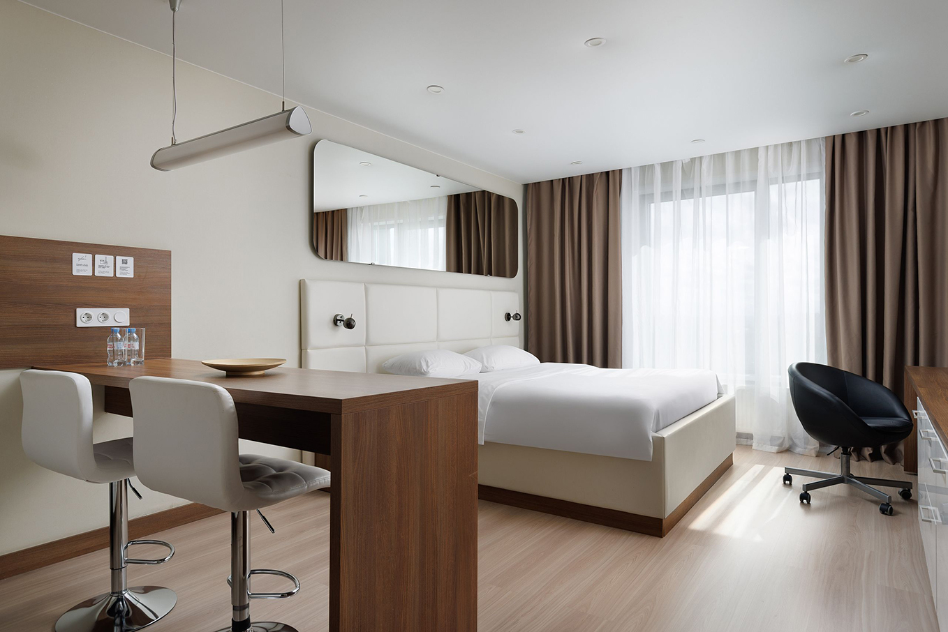 Superior apartments are ideal for 1-2 people. The interiors of the apartments presented in calm beige and brown tones. Such a color scheme allows residents to easily adapt the apartments for themselves, create an atmosphere of home comfort, adding color accents using accessories or plants. There is a total of 252 Superior apartments in the complex with a different layout of furniture - you can always choose something to your liking.