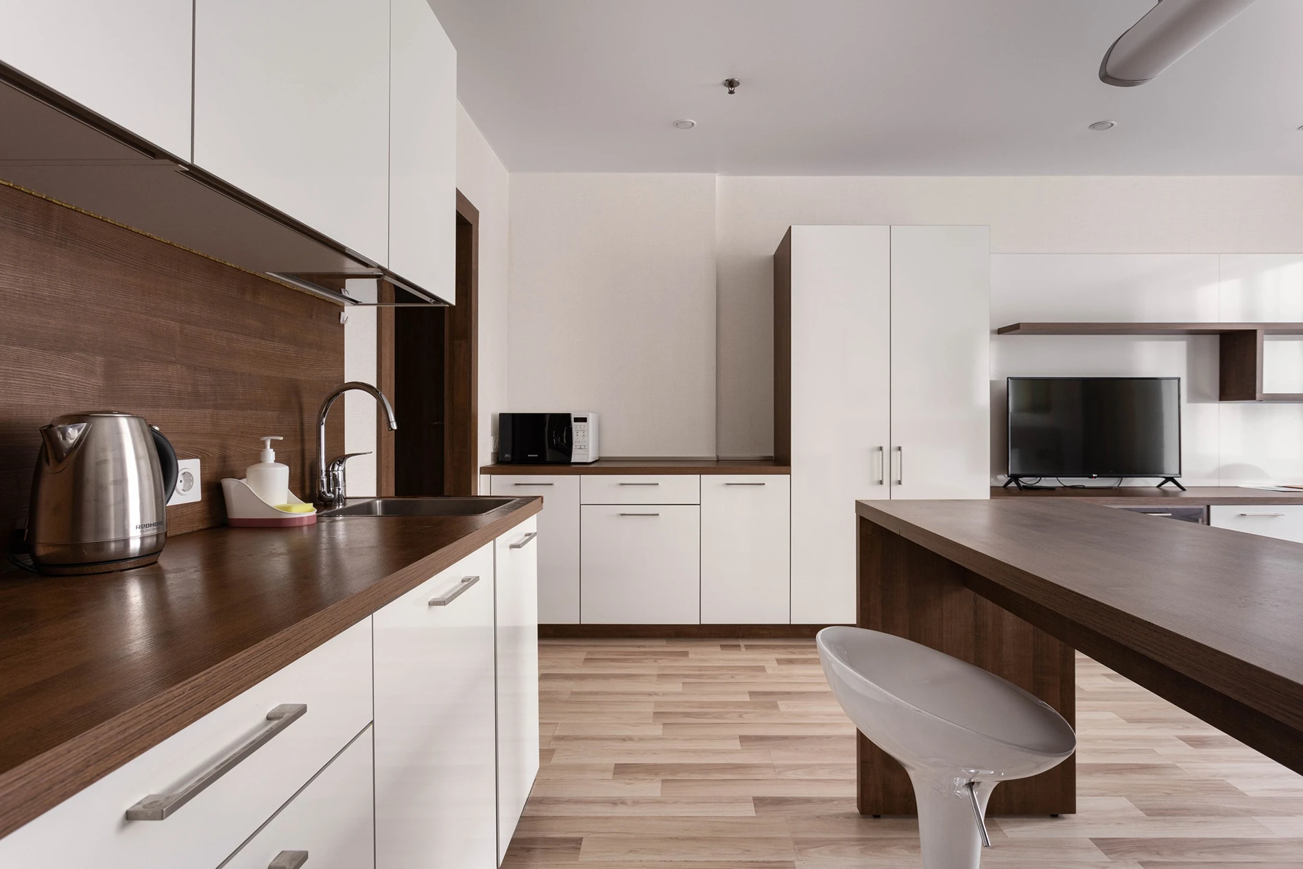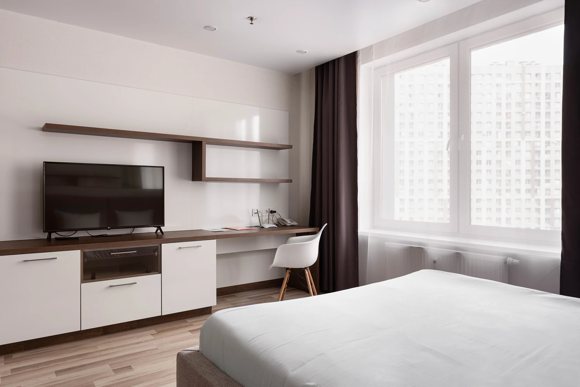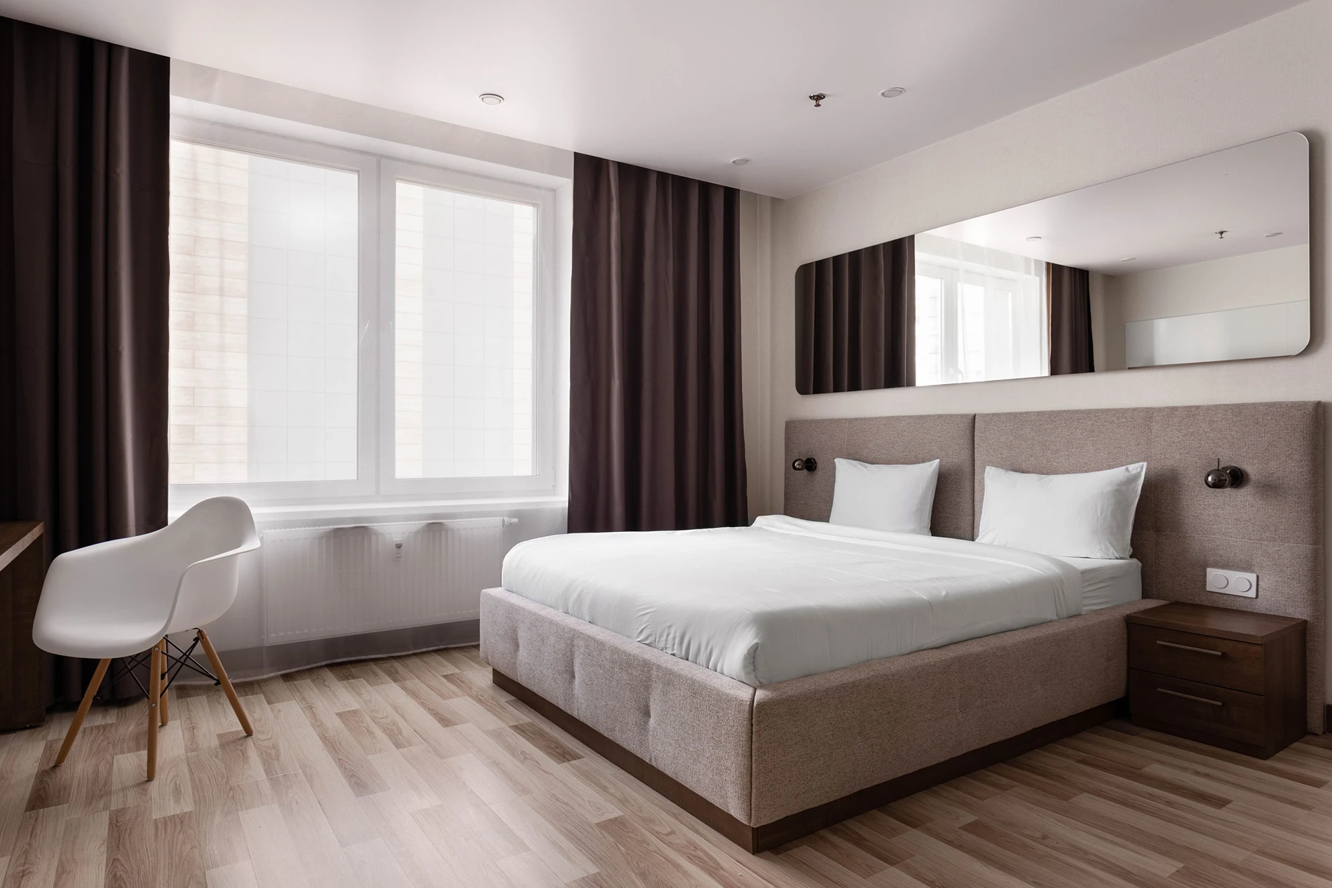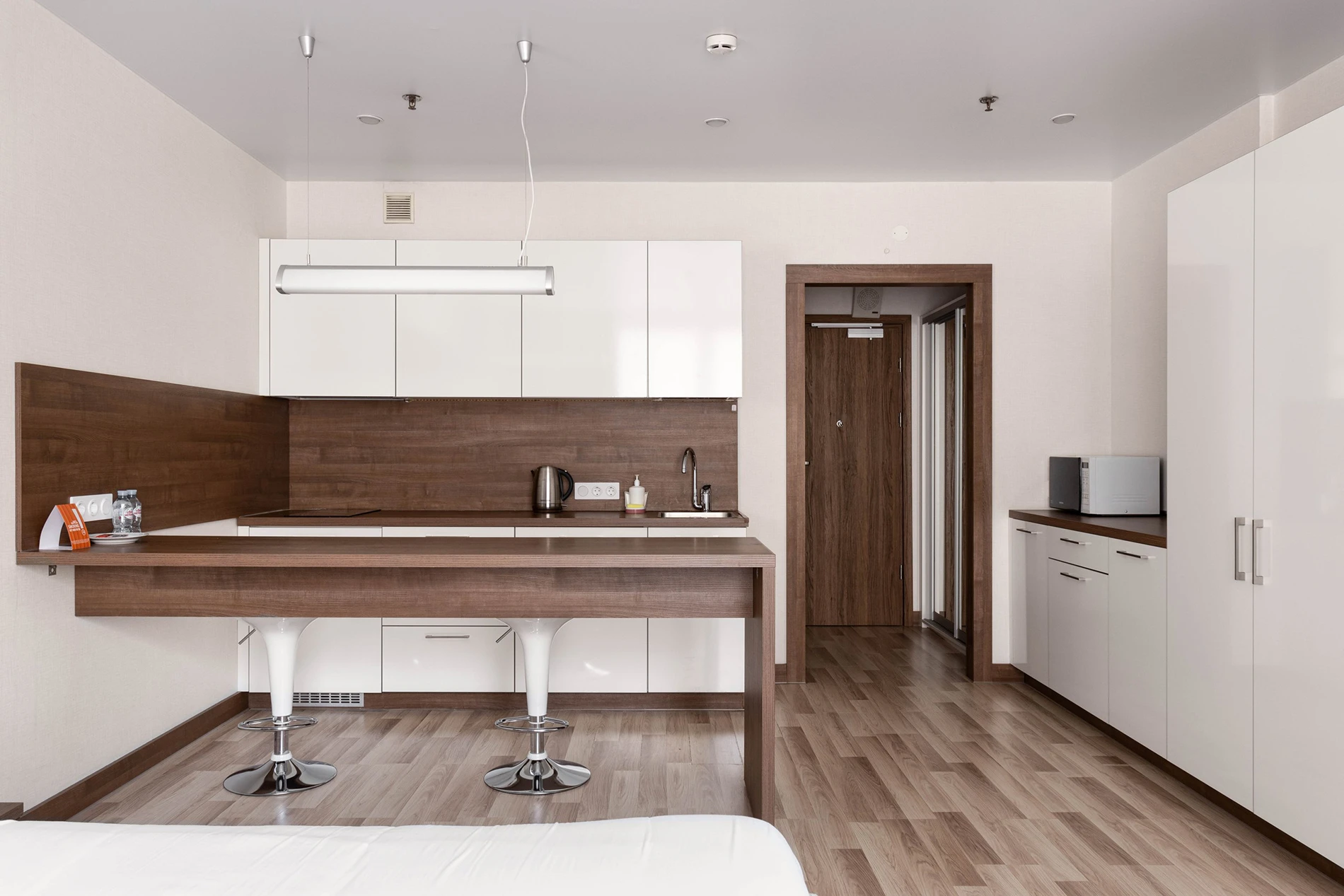 The most popular category is ideal for one or two people. Perfect for both short-term and long-term residence Standard apartments are fully equipped with furniture and a kitchen. The interior is decorated in calm beige and brown tones, creating an atmosphere of home comfort.