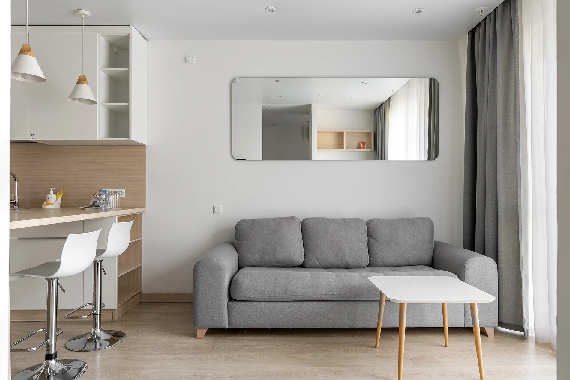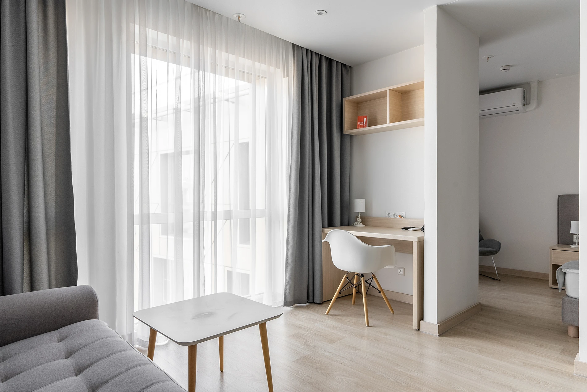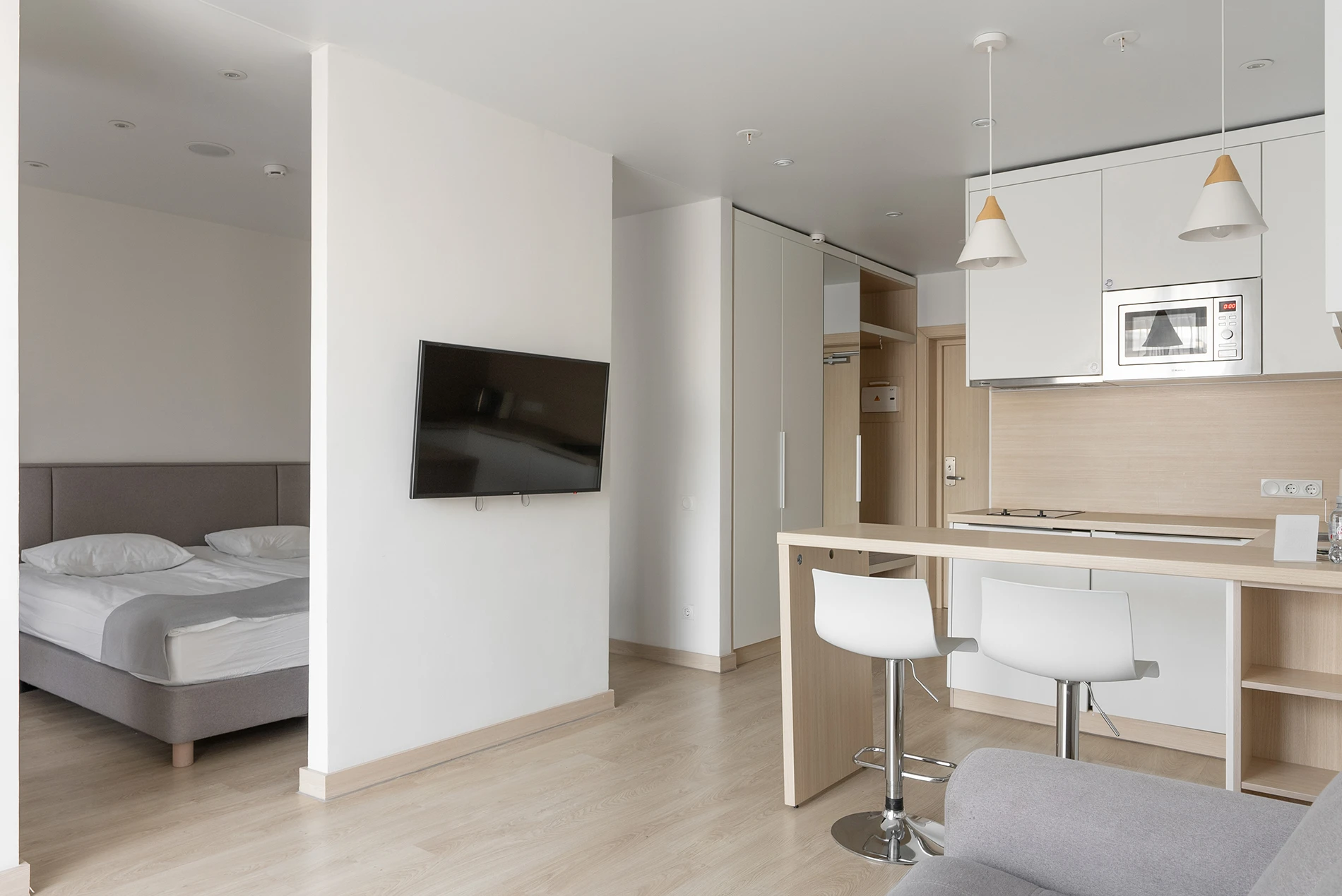 Corner deluxe apartments stand out for their non-standard planning concept: all of them are located in corners of the building. Apartments with an area of 41-54 sq.m. are ideal for families, because there is a separate bedroom, a spacious kitchen-living room with a sofa and a private dressing room.