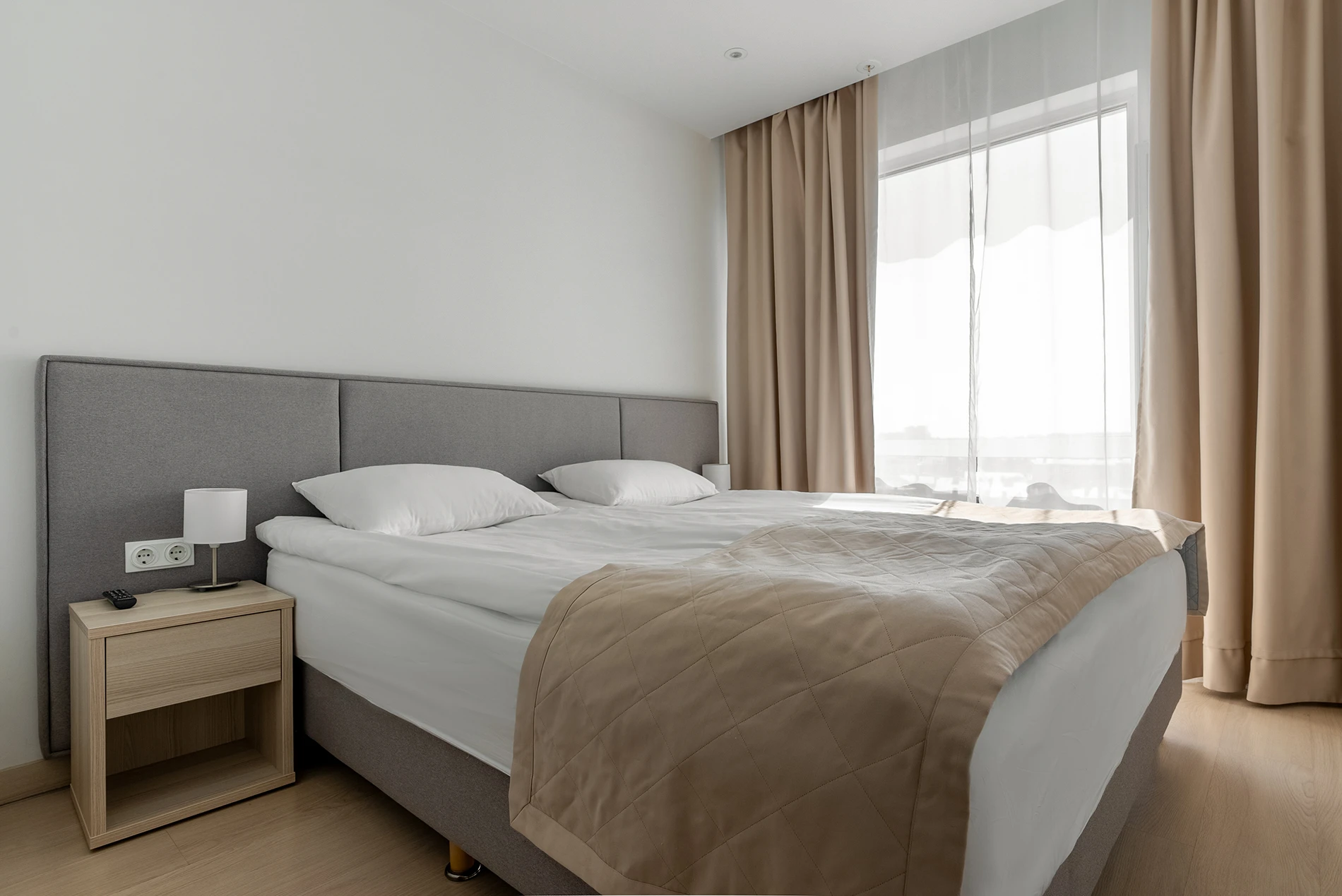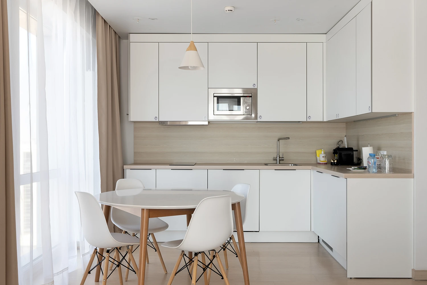 Spacious Executive suite apartments are the best choice for a big family. A diverse range of planning solutions allow to comfortably accommodate and use all the facilities of the apartment: two bedrooms, two bathrooms, a kitchen with a dining area and a living room. Panoramic windows will let more light in. The interior is decorated in calm beige and brown tones, creating an atmosphere of home comfort.