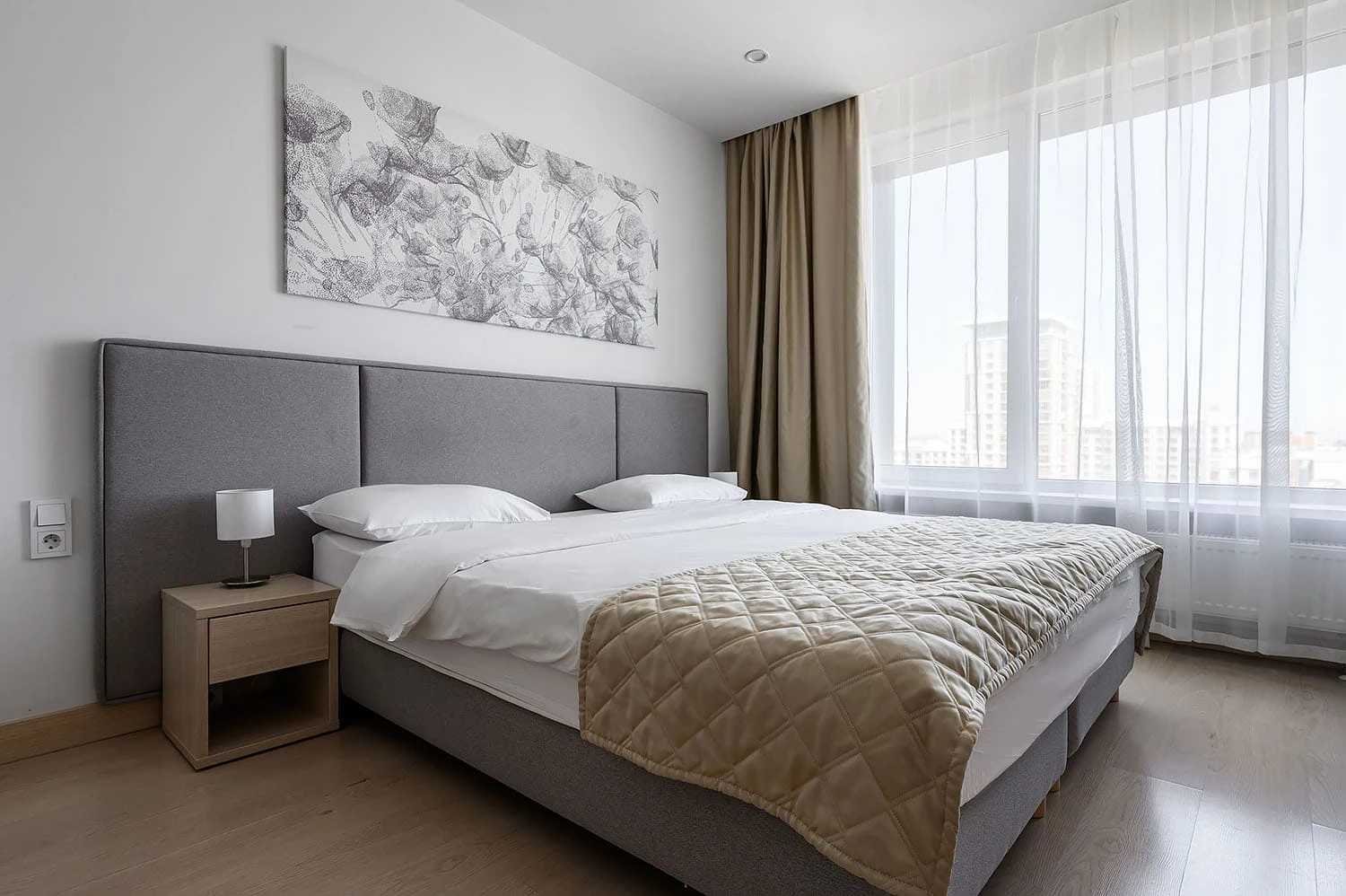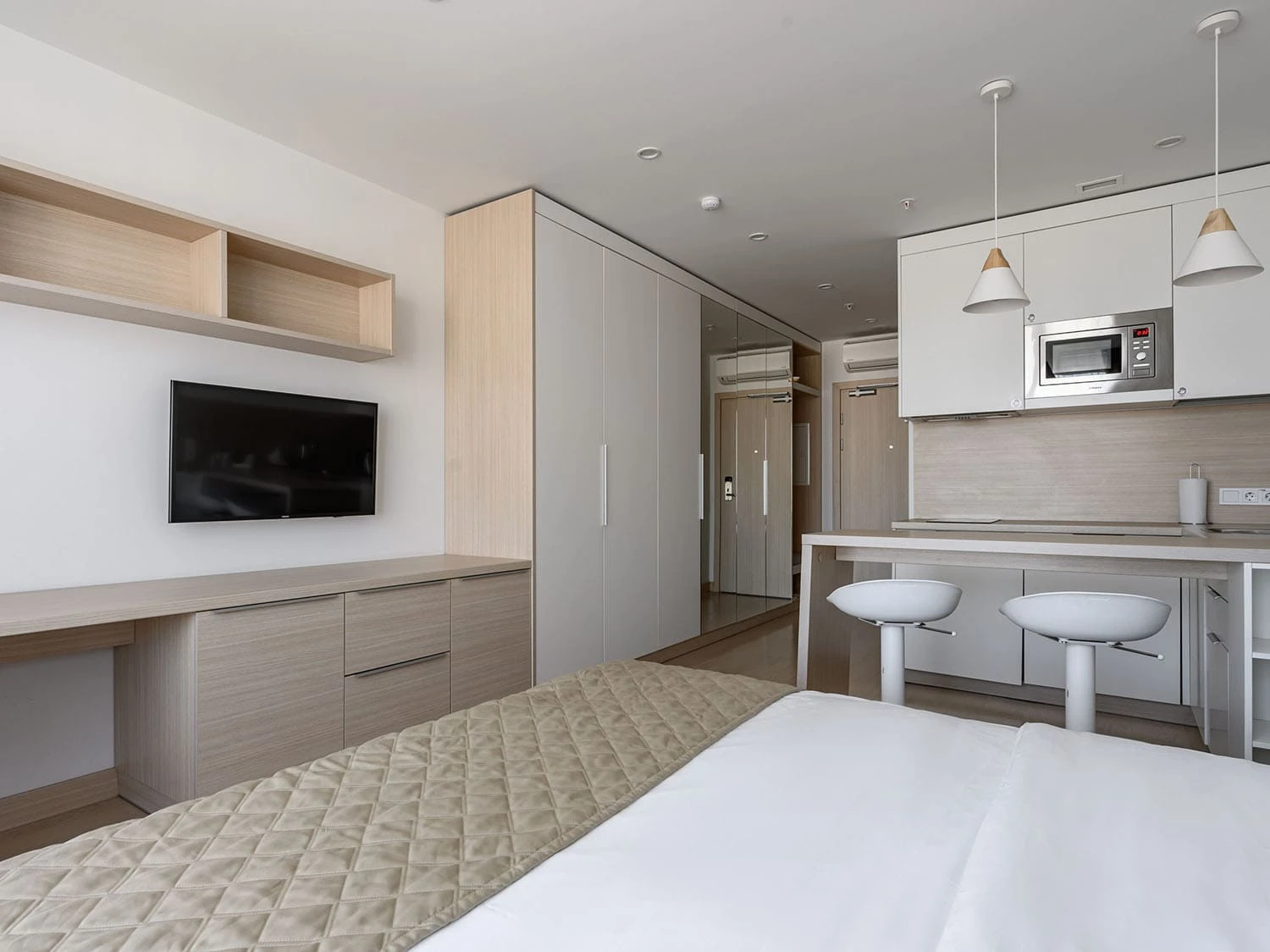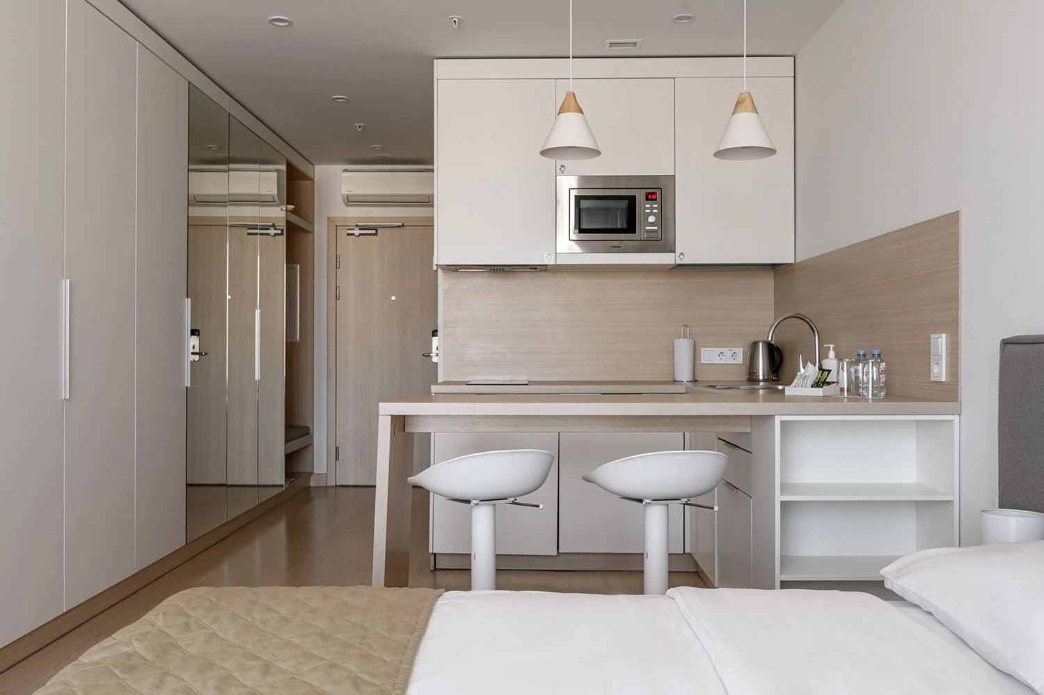 А при краткосрочной аренде также доступны уборка 1 раз в 3 дня, быстрый и надежный интернет. В номере предусмотрены фен, утюг, сушилка и гладильная доска, а также постельное белье и полотенца, посуда и столовые приборы, косметические принадлежности (мыло, шампунь, гель для душа).