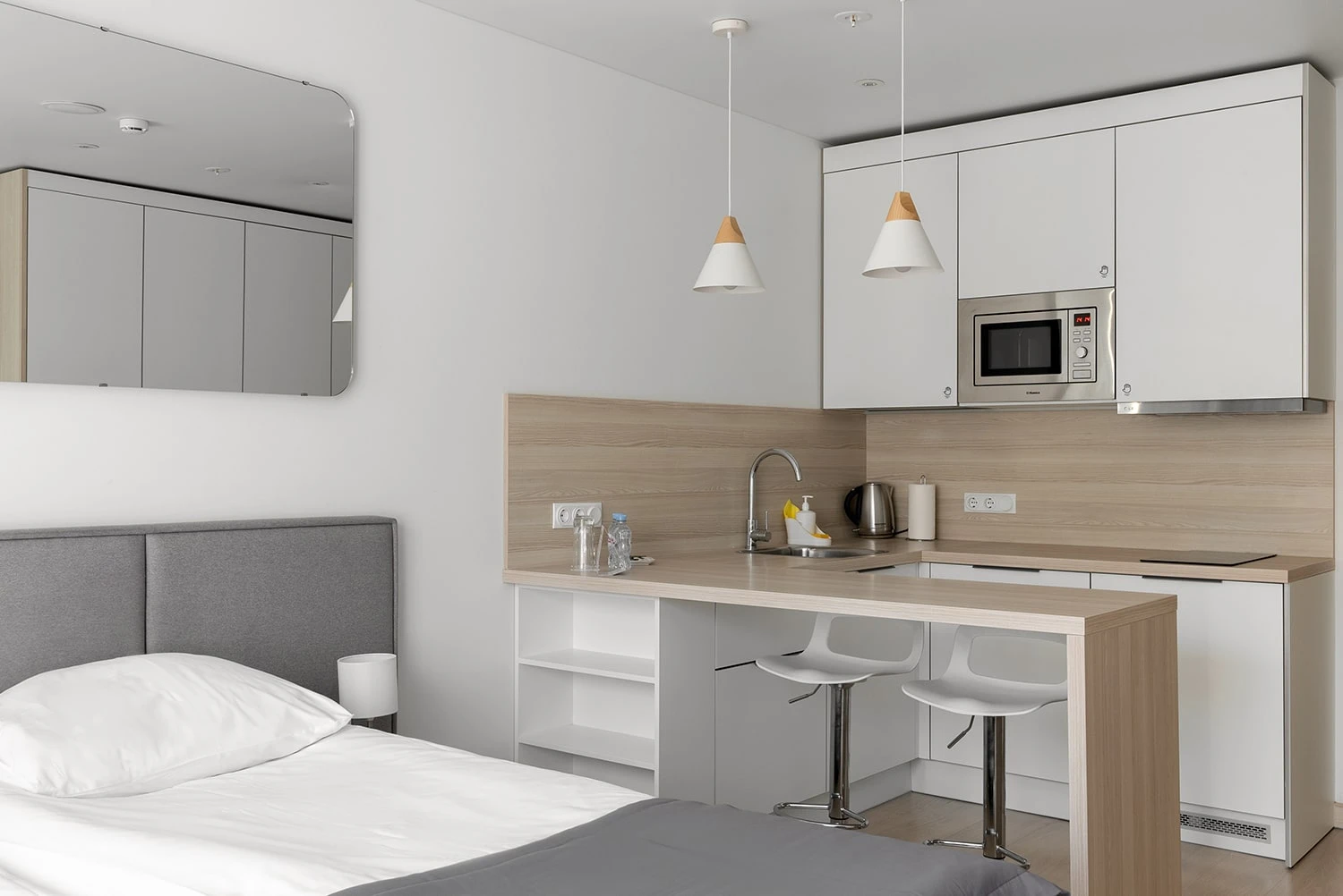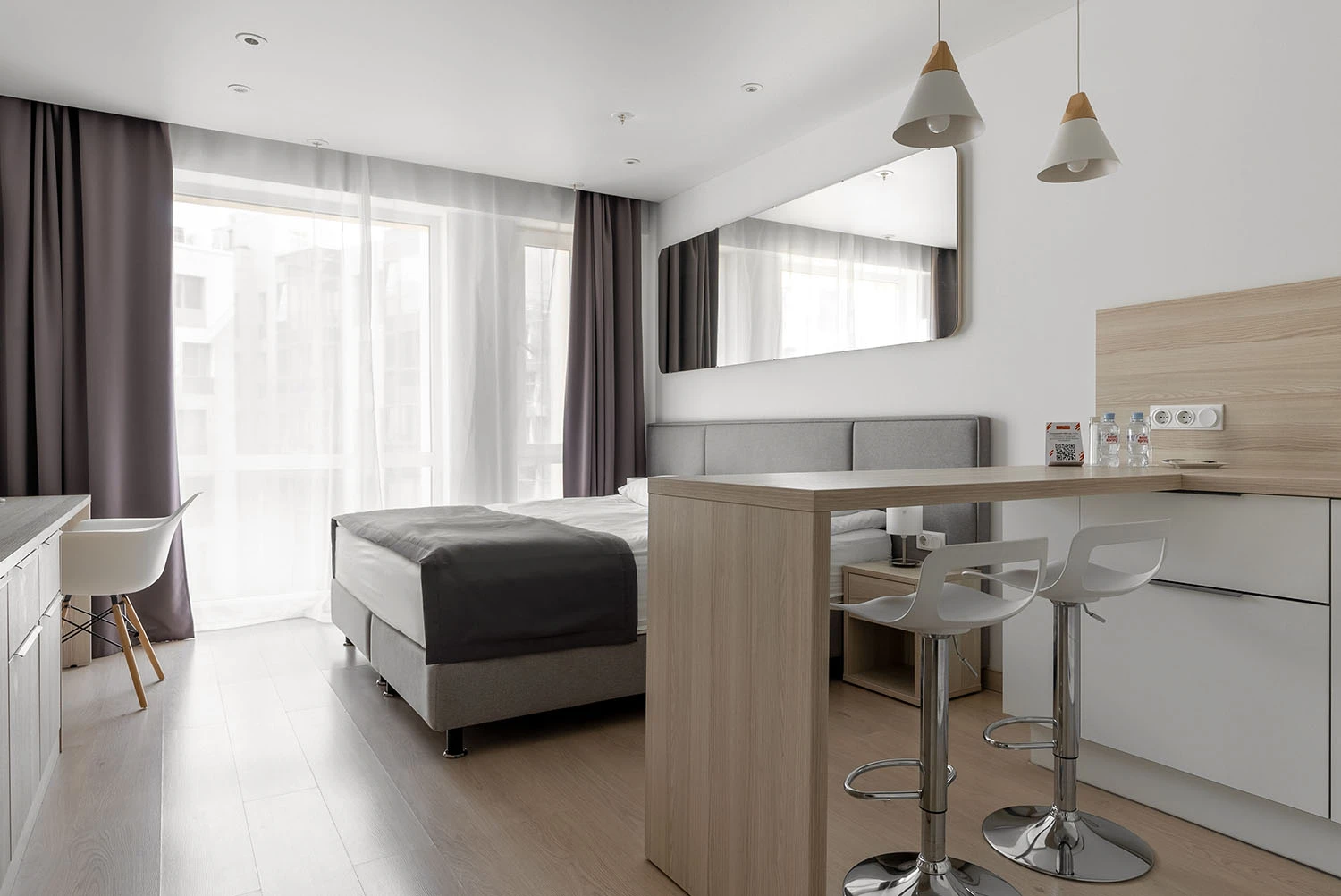 А при краткосрочной аренде также доступны уборка 1 раз в 3 дня, быстрый и надежный интернет. В номере предусмотрены фен, утюг, сушилка и гладильная доска, а также постельное белье и полотенца, посуда и столовые приборы, косметические принадлежности (мыло, шампунь, гель для душа).